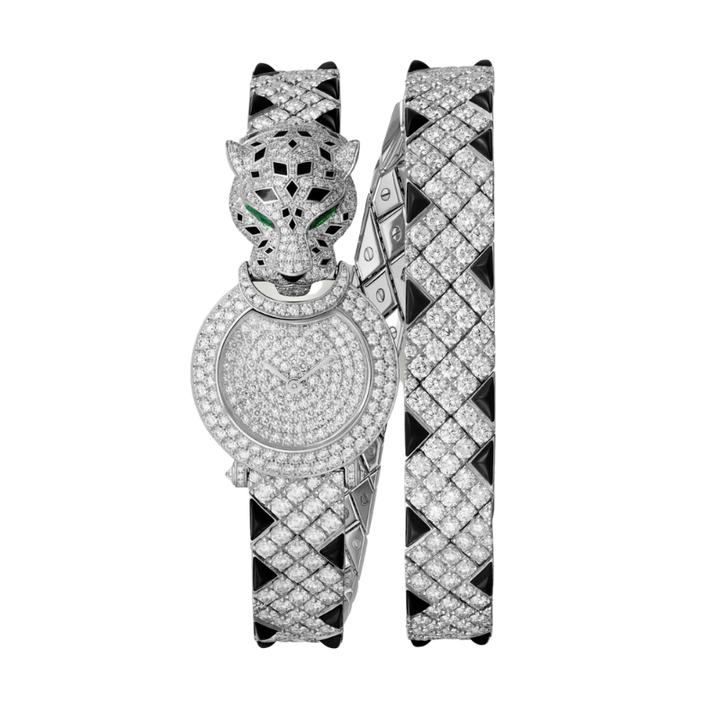 A timepiece that seamlessly transforms into a captivating adornment. the Panthere de Cartier stands out as one of Cartier's most unique designs. Embellished with opulent gold. dazzling diamonds. and exquisite gemstones. it epitomizes a timeless accessory for a woman destined to capture attention. Its magnetic allure. untamed spirit. feline grace. and unbridled freedom make it a truly remarkable piece.